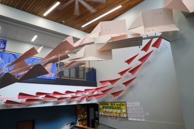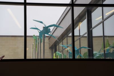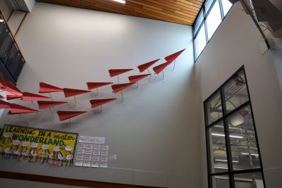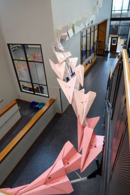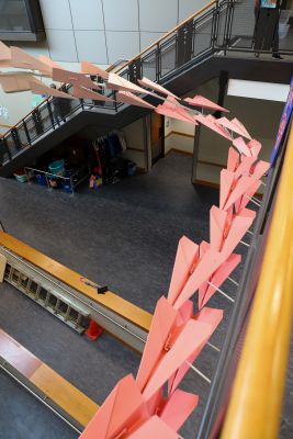 Learning / Experience / by Nick Goettling loops through the two-story entry space at the center of the school. It begins as a folded "paper" airplane (made of aluminum). Once outside it transforms into birds and leaves. Then it wraps back inside the school, transforming into sheets of school paper. Goettling notes, “Our public schools prepare each student to go out into the world, and through their individual experience, become teachers to the next generation. We all have lessons to learn and to teach, and this work celebrates that collaboration between teachers and students.” Goettling's design uses simple, folded, aluminum metal sheets that transform from beginning to end. The airplanes range from a pale blue color to green, then white, and then pink, with a chrome effect.