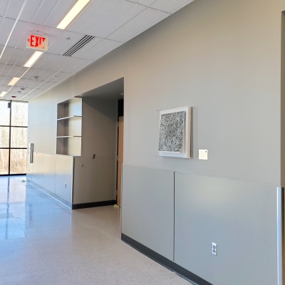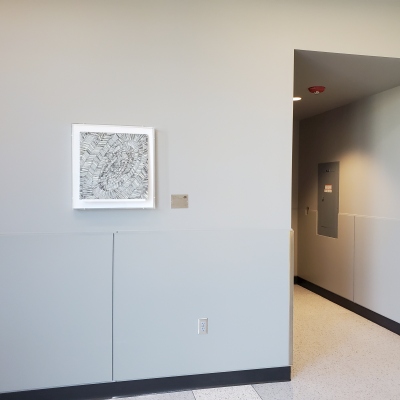 Tessellated Gyre by Katie Miller explores human altered landscapes caused by mining and extraction processes, including open-pit mines. Its creation also explores extracted minerals in that it is a line drawing in glass created by a chemical reaction between lead and selenium in the glass at high temperature in the kiln. The two types of glass chemically react where they touch each other and create a third blue-gray color with a thin line drawing effect. This artwork is part of a curated collection by Renee Adams in March 2023 for a new Science & Technology Building at Walla Walla Community College, in Southeastern Washington. The collection brings together artists who combine art and science. They use scientific approaches such as observation and experimentation, precise measurements and calculations. A desire to learn more about our world and share that knowledge is at the heart of both scientific and creative pursuits.