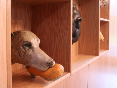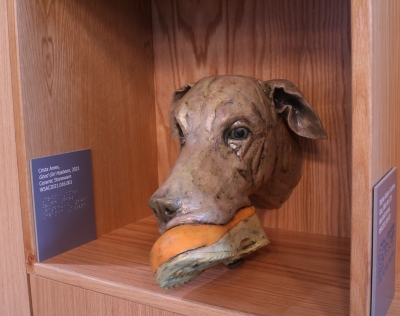 Good Girl HasBeen by Crista Ames explores the saying "you can't teach an old dog new tricks." Has HasBeen learned to fetch her owners shoe or is she fighting the urge to chew the leather of the clog she is named after? You might find more clues in the dog's head shape and ears, or in which foot the shoe is made for. This artwork is part of a curated collection by Gregg Schlanger in October 2023 for the Washington State School for the Blind in Vancouver. The local Art Selection Committee wanted artworks that anyone can approach and fully experience and understand via more than just sight. Gregg Schlanger selected artworks that are comfortable in the hand and have a tactile experience. This artwork is meant to be touched. It is installed in a large shadow box wall with ten spaces for ten accessible artworks.