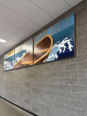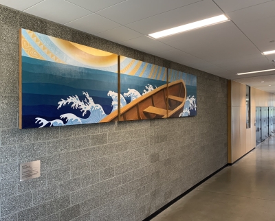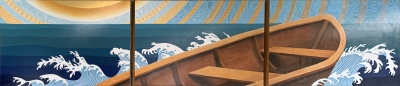 Uncharted by Gabrielle Abbott is a large mural showing an empty, symbolic rowboat in a surreal landscape. Abbott notes, "It takes courage and determination to navigate the waters of an ever-changing world." The waves and the sun are stylized and patterned, in reference to Chinese and Japanese block prints that use similar styles. Abbott designed the mural with pencil and watercolor paints on paper. Then she used digital illustration tools to create a detailed, to-scale mockup that she used to handpaint the final mural on wood panels.