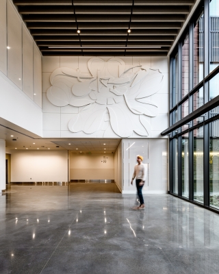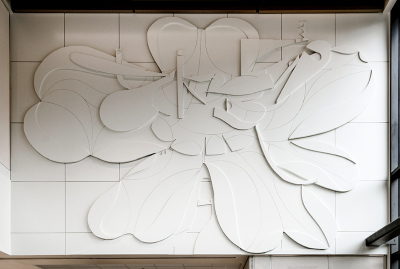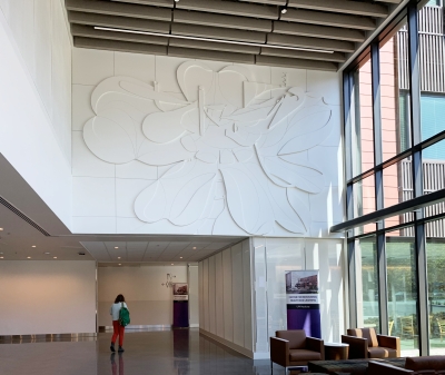 A Sprout in the Desert is a two-part, site-specific artwork by Hernan Paganini. Using the light and shadows, and the movement of the sun inside the hospital, the relief artwork captures these elements and reflects them into the space. It uses our senses to create a meditative and nourishing space. Paganini uses the large-scale flowers to transform the space into a large, natural landscape. The flowers represent nature awakened, where life manifests, expands, and breathes – they bring with them the possibility of being. Paganini notes that “Resting in the garden, my soul is nourished, I contemplate the day and its endless possibilities, the healing is one with me.” The local Art Selection Committee wanted the art to be like a second skin of the building, that transports people to a gentle, soft, and caring state of mind. Paganini tried to use the building to tell a story through the two artworks.