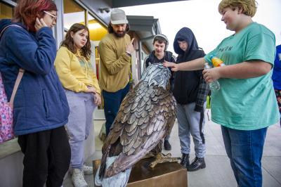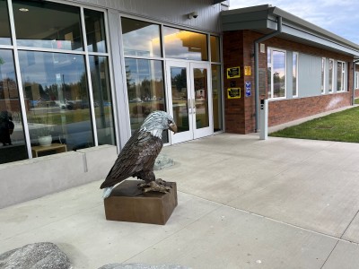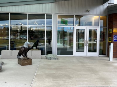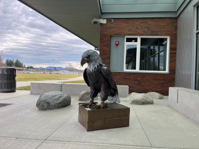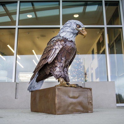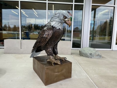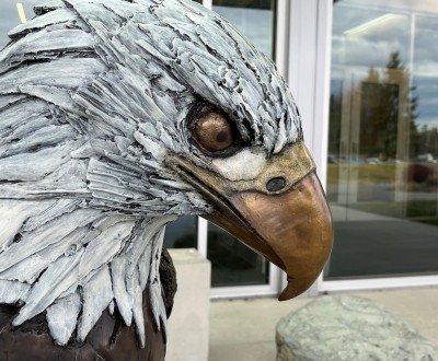 Young Eagles by Scott Fife is a set of two sculptures that depict young birds just as they are gaining maturity, but with white markings. Fife notes, "These are the bald eagles that soar on thermal convection currents, roosting on tall trees throughout the coastal Puget Sound. The birds appear as school age raptors resting on cardboard boxes, reminding viewers, who include children and youth, of transformation in the world. They represent change, just as the original artwork was once cardboard now transformed into cast bronze sculpture." The Bald Eagle is the largest true raptor in North America, the national bird of the United States. Sacred and iconic, it is also a spiritual messenger to Native Americans. The bird has made a recovery from being endangered not long ago to being ever present, and today its natural range covers most of the continent. Scott Fife created the original sculptures out of cardboard that was cut and pieced together with drywall screws and glue. They are based on Fife's careful study of eagles in nature and from photographs. Molds were taken from the cardboard sculptures, and then used to make the bronze casts.
