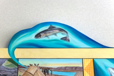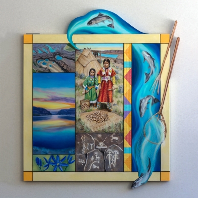 Water Gifts is a series of five paintings by artist Susan Aurand. The artworks reflect the importance of water in the history and life of Quincy, in Central Washington. By visually bringing nature into the school, it is an invitation to students to appreciate how much life exists around them. It is also a challenge from the artist to learn more. Aurand notes: “Water is a good metaphor for learning. Education is waters for the mind, allowing new ideas and perspectives to grow and children to flourish.” Aurand did extensive research on the geology of the area, the town of Quincy, and the Columbia Basin Irrigation Project which began in the 1940s.