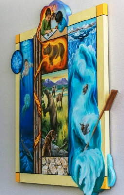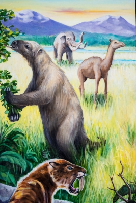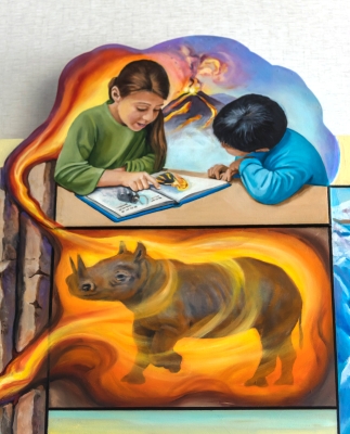 Water Over Land (part B) shows the geological history of the area, which was once a primeval ocean floor. The waters left a plateau of rich soil and carved out the nearby “ancient lakes.”
