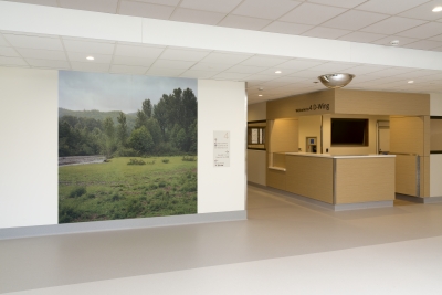 Lester, WA by Jenny Riffle is about nature and its calming and healing effect on humans. Riffle notes, "I am especially interested in the forest and our connection to it, which can be seen throughout history in folklore and fairy tales. The forest is often portrayed as a very powerful place of transformation, once traveled through you come out the other side changed, empowered. It is a place to connect to nature, a place of contemplation and magic." This photograph was taken in green spaces around Seattle. Riffle tries to bring some of the power and magic of the forest to viewers, so that we can experience calmness and a connection to nature indoors. Lester is a ghost town near Stampede Pass, just south of Snoqualmie Pass and northeast of Mount Rainier. It was founded in 1892 by the Northern Pacific Railway. This artwork is part of a curated collection of Northwest-based artists by Dawna Holloway at the UW Medical Center Northwest in North Seattle, Western Washington. The local art selection committee wanted artworks that would create a welcoming, peaceful environment for the patient floors of the new Behavioral Health Teaching facility. The photographs were printed onto Acrovyn, an industrial wall covering. They span floor-to-ceiling to bring lush nature inside, transforming the residents’ sterile surroundings.