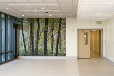 Snoqualmie Valley by Jenny Riffle is about nature and its calming and healing effect on humans. Riffle notes, "I am especially interested in the forest and our connection to it, which can be seen throughout history in folklore and fairy tales. The forest is often portrayed as a very powerful place of transformation, once traveled through you come out the other side changed, empowered. It is a place to connect to nature, a place of contemplation and magic." This photograph was taken in green spaces around Seattle. Riffle tries to bring some of the power and magic of the forest to viewers, so that we can experience calmness and a connection to nature indoors. The Snoqualmie Valley is east of Seattle. This artwork is part of a curated collection of Northwest-based artists by Dawna Holloway at the UW Medical Center Northwest in North Seattle, Western Washington. The local art selection committee wanted artworks that would create a welcoming, peaceful environment for the patient floors of the new Behavioral Health Teaching facility. The photographs were printed onto Acrovyn, an industrial wall covering. They span floor-to-ceiling to bring lush nature inside, transforming the residents’ sterile surroundings.