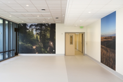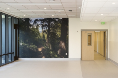 Mountain Trail, Methow Valley, WA by Ethan Bickel is a study of nature and light. Bickel takes inspiration from the natural world and how it interacts with the built environment. This artwork is part of a curated collection of Northwest-based artists by Dawna Holloway at the UW Medical Center Northwest in North Seattle, Western Washington. The local art selection committee wanted artworks that would create a welcoming, peaceful environment for the patient floors of the new Behavioral Health Teaching facility. The photographs were printed onto Acrovyn, an industrial wall covering. They span floor-to-ceiling to bring lush nature inside, transforming the residents’ sterile surroundings.