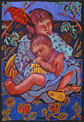 Rain by Joe (wahalatsu?) Seymour, Jr. (Squaxin Island and Pueblo of Acoma) expresses his passion for the environment and his Native heritage. He hopes that through his art, people will remember how precious the environment is and will take actions to protect it.