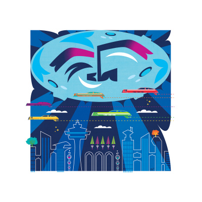Smiling at Progress by Jeffrey Veregge is part of a series that honors the history of science and industry in the Washington State. He drew it in his "Salish Geek" style, combining form-line designs with pop culture imagery of Seattle and futuristic flying vehicles.