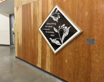 EVERYTHING WE NEED SIEMPRE HA ESTADO AQUI by Letra Chueca Press is inspired by our Mother Earth, in thanks for everything she has if we pay attention. It features comfrey, a medicinal plant known as a powerful healer. Comfrey can also be a symbol of resilience as it is a hard plant to get rid of, because if even a little piece of its roots are left, it will grow back. This large linocut print was printed using a steamroller.