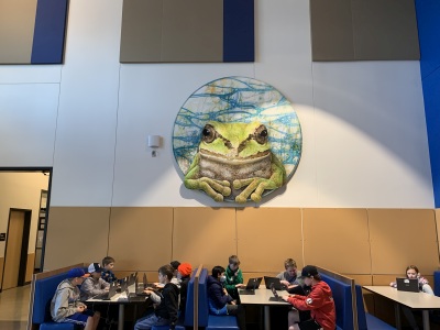 Water by Mindy Barker is one of three paintings that show the native animals of the lower Columbia River in Southwestern Washington. A barred owl represents air, a white-tailed deer represents soil, and a northern Pacific tree frog represents water. Barker notes, "The animals gaze outward, looking directly at us – a plea and reminder that we share in the work of maintaining the delicate balance of life in our water, air, and soil ecosystems." The animals are cut-outs that sit in front of round, painted panels of magnified cross-sections of local plants and micro-organisms.