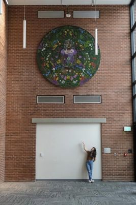 Medicinal Tapestry by Christie Tirado depicts a central healer figure holding a bowl of medicinal plants, roots, and fungi, and surrounded by a variety of medicinal plants. The imagery and ideas are based on responses that Tirado received when she visited the site at the Washington State University Spokane. She held an art workshop on what "health, healing and wellness" means to the Spokane community. She notes "I want it to […] connect the idea of Western Biomedicine (which emphasizes science and technology) in healing practices, but also honor and celebrate ethno-medicine and the way non-western health systems and different cultures have and continue to use natural healing remedies, and acknowledge our relationship as humans with plants, animals and the natural world.” The healer figure and plants were hand-carved and painted. The uncarved space of the panels is painted black. This design hints at Tirado's other artworks which are mainly woodcut and lino prints.