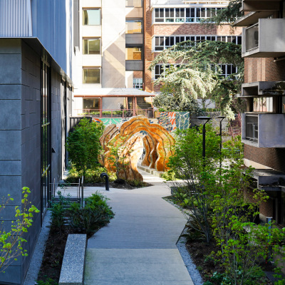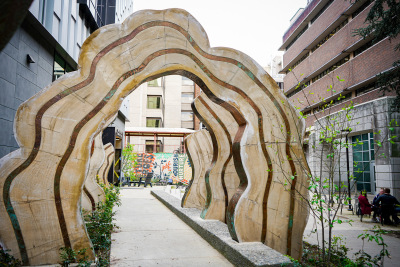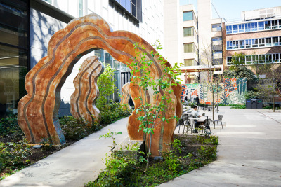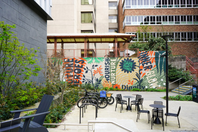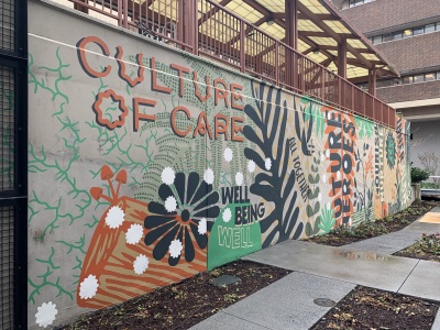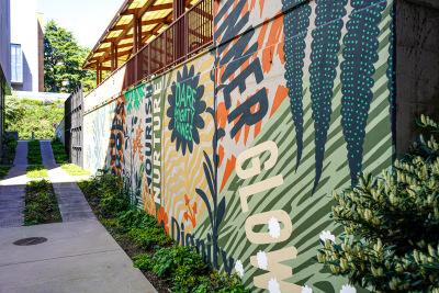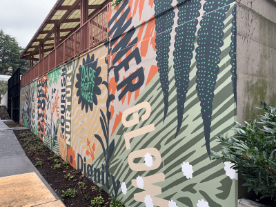 Flourish / Thrive by Acrylicize celebrates the growth of a community as a diverse range of species, flourishing and thriving. Within the mural, you can barely see the nurse log at the bottom as it supports a vibrant ecosystem. Within this mural are various patterns and shapes that bring the plant life of the Pacific Northwest to life. This diversity of plant life represents all of the individuals and communities impacted by medical professions. They are able to thrive because of the support and nourishment provided by individuals studying at the UW. A nurse log is a fallen tree that, as it decays, provides enriching elements for seedlings to grow. This is strikingly similar to the uplifting culture of care that the UW medical programs provide to their patients and communities. The UW Health Sciences Education Building is like a nurse log: a symbolic backbone to the UW community and the growth that takes place because of it.