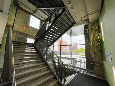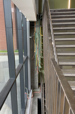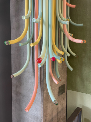 ENTWINE by artist team Area C Projects is spread throughout the first three floors of Washington State University's Plant Sciences Building. The four site-specific sculptures mimic the exposed materials of the building's essential systems: such as the electrical, air, and water systems whose pipes and ducts that can be seen throughout the building. The artwork creates spreading, vine-like growths on columns and walls, merging with the building as if it is a host organism to a colorful invasion of curious, plant-like beings. The artwork represents the plant world’s deep entwinement in the fabric of human life. The artists note that the sculptures intentionally blur "the line between where building ends and artwork begins".