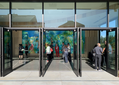 LIFE by Roberto Delgado is semi-abstract mural made with collage techniques. It includes image fragments from photographs and other graphic materials related to the Washington State University Vancouver campus, the region of Southwestern Washington, and academic disciplines taught within the Life Sciences Building. The final result is a semi-abstract mural with bright colors and plenty of patterns. This mural is installed within an architect-designed recess on a curved wall. This four-part artwork is composed of three murals and a series of tiles installed into the floors.