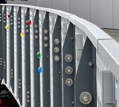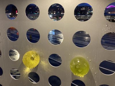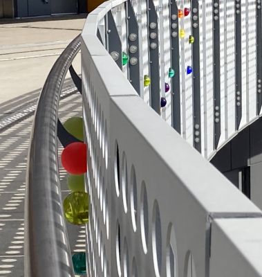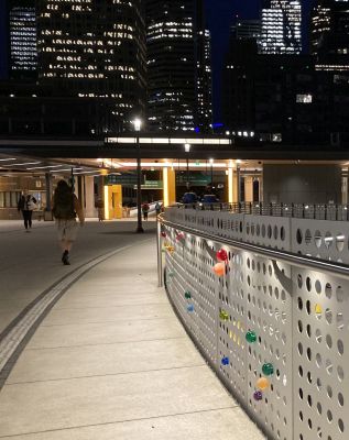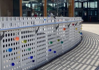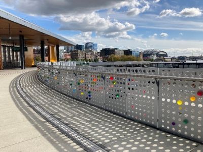 Navigations by Elizabeth Conner uses resin spheres to explore how people over time have navigated across water, as well as how ferry riders would move along the walkway to or from their ferry. The 450 resin spheres are mounted in different patterns on the metal guardrail panels. The patterns suggest many things, such as: constellations and navigating by the stars; a musical score; the rhythms and speeds of pedestrians, strollers, and suitcases; an abacus for measuring and counting; or ancient ways of telling time. Different hues and diameters suggest relative magnitude of navigational stars within constellations.