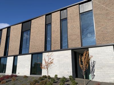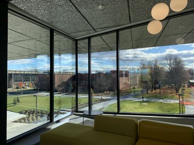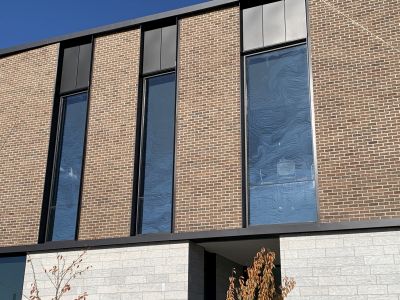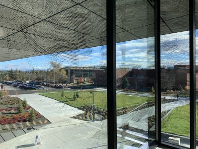 Aperture by Jill Anholt expresses the vortexes, eddies, cascades, and flows of the Spokane River that is just beyond the sƛ̓x̣etkʷ Fine Arts and Photography Building. The art glass installation evokes the creativity, energy, and dynamism that resides throughout the building and the art department. The imagery appears as a continuous, highly visible and fluid element running across the upper façade of the building’s windows. Anholt created the art glass using a highly reflective chromium frit glass that mirrors the surrounding campus and the conditions of the sky.