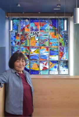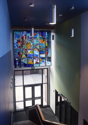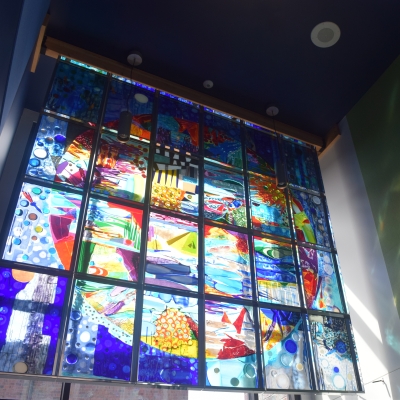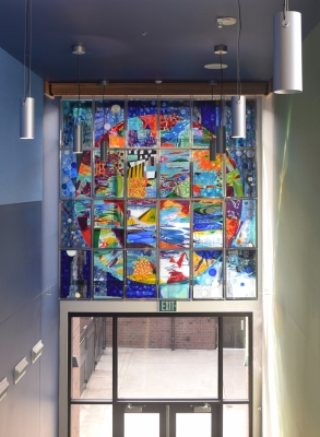 Topophilia - Hope Peace Dream Growth by Keiko Hara references nature, growth, the elements, and the cosmos. It is about viewers’ inspirations and desires. Hara wanted to create something to "uplift the spirits and spark the imaginations” of all who pass the artwork. Pattern, color, texture, and reflectivity are used to create layering and depth in the glass artwork.
