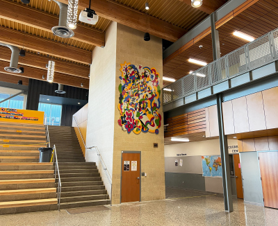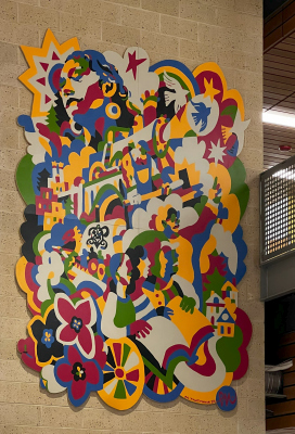 Legacy, Land & Future by Misha Tyutyunik represents the students, the school, and the diversity and cultures of their community at Shaw Middle School in Spokane, Eastern Washington. The painting also encapsulates the history, legacy, the land, and the future dreams of the people that live and have lived there. In the upper left, a contemporary Spokane Indigenous youth looks into the distance, acknowledging the local Indigenous peoples and assuring that they are very present in the school and community. A steam engine locomotive and smokestacks represent the neighborhood’s long working class history. Birds and stars symbolize the hopes and dreams of the local students and community. Various symbols represent their diversity. Students hold an open book symbolizing knowledge and wisdom, and a teacher leads the way to a thriving community. The Spokane River is also featured, with a Viking boat to represent the area’s immigrants. A turtle on the boat’s sail represents the local Pacific Islander community, as well as longevity, strength, and protection. The painting’s design flows and leads the eye around the imagery. It is all interconnected, just like the school’s community. Misha Tyutyunik transferred the painting’s design onto four plywood panels using a projector. The basic shapes were painted with the help of Shaw Middle School students. Tyutyunik refined some of the painting and shapes, added finer details, and then cut out each panel using a jigsaw.