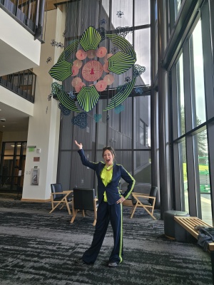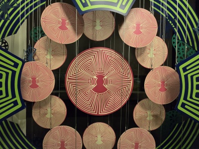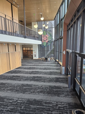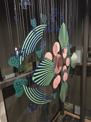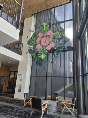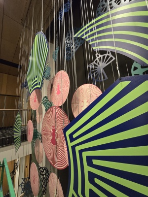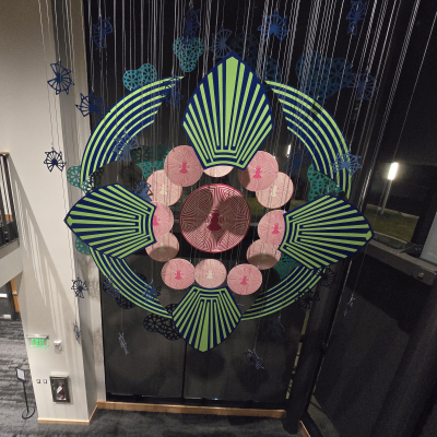 That Which Colors the Mind by Raylene Gorum references Indian classical music, as well as mandalas and lotus blossoms present in Indian culture. It consists of 86 hanging elements whose patterns and organization is based on raga and tala systems, which are foundational elements in Indian classical music theory. In very simple terms, the raga is the notes and melodies, while the tala is the time cycle that creates the rhythmic structure. Gorum chose this symbolism because of the artwork's location near the high school's concert hall.