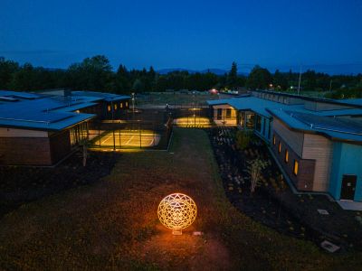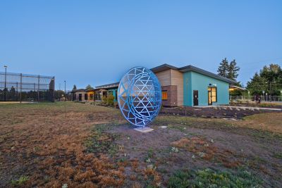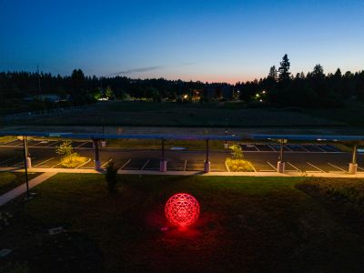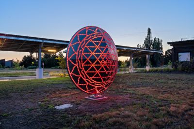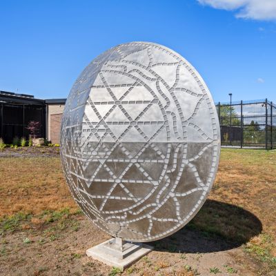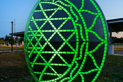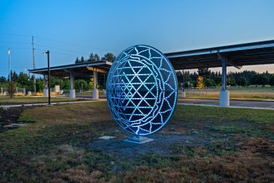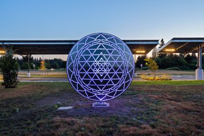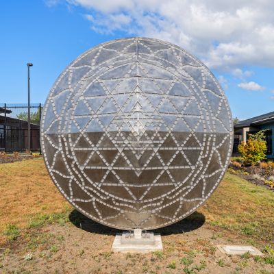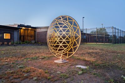 Mandala by Blessing Hancock encourages a meditative state to silence the inner critic and calm the mind. Lighting within the sculpture changes, creating a warm and contemplative space throughout the day. “Mandala” means “circle” in the Sanskrit language, and the sculpture represents a safe, contained, healing space.