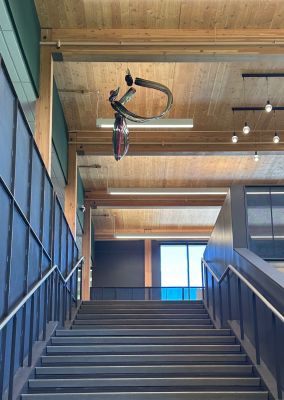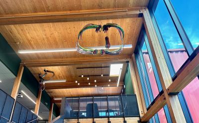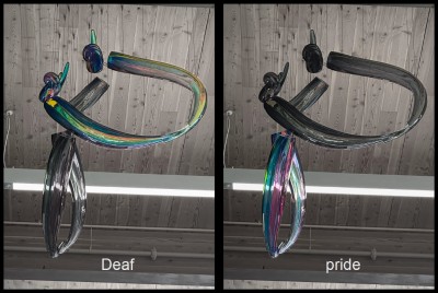 Deaf Pride by Orlosky Studio is one of three suspended glass sculptures that are visualizations of American Sign Language messages. The sculptures are a daily reminder for students at the Washington School for the Deaf (WSD) in Vancouver, Southwest Washington that “You are important,” “We can do anything,” and to have “Deaf Pride.” The sculptures also highlight the beauty of sign language. All together, this series of three sculptures is titled We Belong.