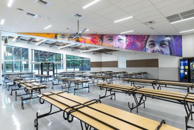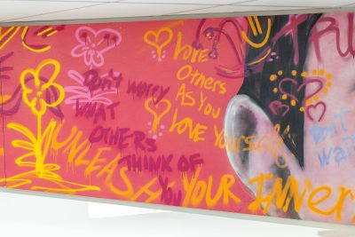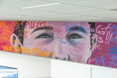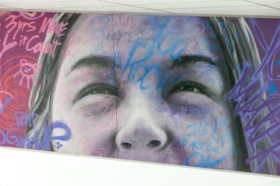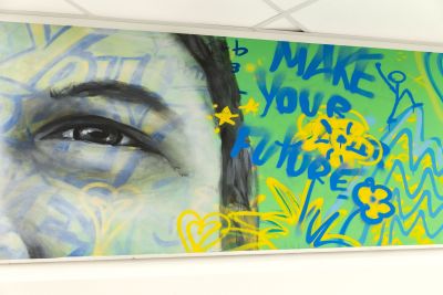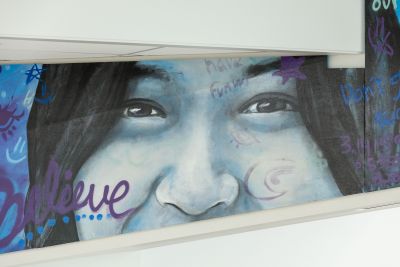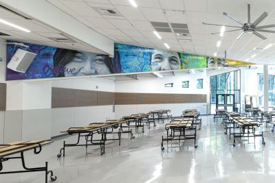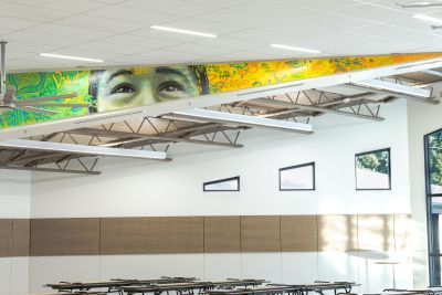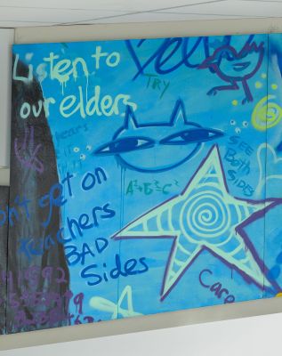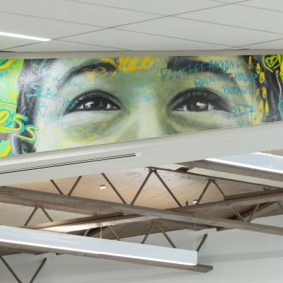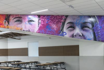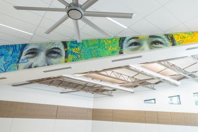 Collective Prism by Brady Black highlights a prism's colors that form visible light and features six Komachin Middle School students from the class of 2024-2025. The translucent portraits reveal a vibrant, student-inspired background, symbolizing how each individual contributes to the collective whole.