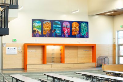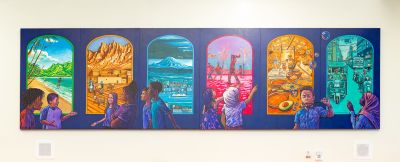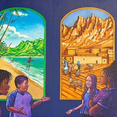 Our Origin Stories by Jesse Watson celebrates the journeys each of us took to get here. Watson’s painting shares the unique cultures represented at the school and city. It also displays some of the things we all share in common, regardless of what continent we came from. The painting shows portals, and each portal is a different place where many students at the school come from. In front of the portals are children who are discovering similar elements from their own origin stories in those of their classmates. Watson stresses the importance of embracing our differences together. Sharing knowledge and culture makes each of us stronger, wiser, and better equipped to move confidently into the future, together.