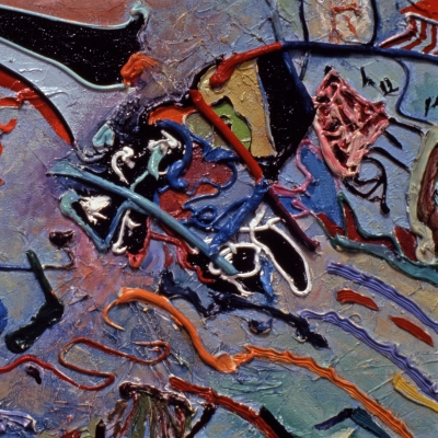 Chimera is a mixed-media painting by artist Linda Kraus-Perez. It is part of her body of richly detailed abstract paintings. This piece is filled with colorful forms and energetic marks. The title refers to a creature in Greek mythology that breathes fire and has the head of a lion, the body of a goat, and the tail of a snake. She notes, "References for this piece come from the viewpoint of a child, the kinds of images the waking consciousness of a child may see. References for the images were kites and dragons. However, they are not literally represented in the work, but more the essence of the character and movements those objects would display, their personality and behavior more evident in the painting than being defined by a literal representation."