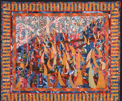 Not Kansas is part of artist Sally Sellers' body of quilts that experiment with technique, texture, and theme. Sellers began these experimental quilts after her young daughter moved from home to a nursing facility due to serious illness. She created this body of work as a form of therapy, as a meditation on control, and her maternal instincts to nurture and protect. This piece features “cut throughs,” a technique in which fabrics are cut and a different fabric is inserted before being sewn back together. She describes how “once the new fabric has been sewn in, it is treated as just another part of the surface for the next cut-through. The result is that the various cut-throughs overlap each other, adding texture and complexity.”