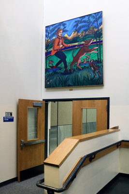 Autumn Walk is part of artist Cheri O’Brien’s body of work that explores the interaction between humans and dogs. This piece captures the plants and animals that she sees on everyday walks with her dogs. She notes, “We often see rabbit and bullfrogs and usually see ducks… I have a beautiful view of the Cascade Mountains and the Snohomish River and often times I will work that scene into my paintings as I have done here.”