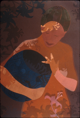 New Jersey-based artist Robin Holder creates prints, paintings, and site-specific artworks. Her art expresses her experiences as a woman and her multicultural heritage. In her own words, "My work is motivated by my multi-cultural background in which layers upon layers of various racial, economic, cultural and spiritual worlds exist within one family... I am developing a visual language of archetypal symbols from Africa, Native North and South America, and Pharaonic Egypt. I use the spears, shields, vessels, masks, magical wands, birds, pyramids, and temples as symbols of rituals and tools used in the battle for wisdom, strength, tolerance, balance and spiritual growth."About Holder's process: "I use combinations of photosilkscreen, color viscosity collagraph, plexiglass, and linoleum. The images are created by cutting out stencils which form the shapes of the Warrior Women, animals, leaves, etc. The stencils are surface-rolled with inks and placed on sheets of inked or painted plexiglass. The plates are then printed on paper using a press... The approach I use is like a collage and my ideas continue to reveal themselves from print to print, like a story, because my stencil shapes are a language that I'm constantly expanding."