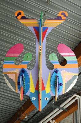 Spokane-based painter Mel McCuddin created the painting "Walking the Walk' to express ideas about personal space and territory. The composition and rooster figure developed for the artist spontaneously, but speaks to "the establishment and defense by gangs of young people, of what is perceived by them to be their own territory or 'turf'."