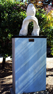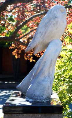 Tony Angell's limestone sculpture Marsh Owl depicts the migratory owl that winters along the Skagit River Delta in Northwest Washington. The artist often visits this area to sketch wildlife. He notes, "Visiting the estuary and watching the birds coarse back and forth over the salt grass and bull rush I am left with the feeling that they, along with other prominent life here, are the very spirit of this place."