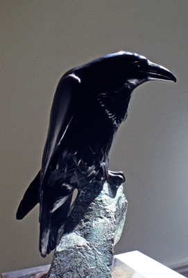 Artist Tony Angell created this bronze sculpture to explore a Raven's form and to "quest towards understanding its eloquence as a species." The Raven, which has a rich mythical history in the Pacific Northwest, is a favorite subject for the artist. He characterizes the bird as "observant, sagacious, playful and loquacious."
