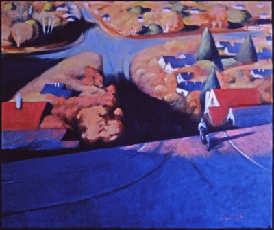 The landscape Down Hill by artist Liang Wei uses color, light, and shadow to investigate how images of nature can represent universal human feelings. Capturing the beauty of the northwest landscape, Liang hopes to "inspire people to appreciate our living environment, which leads our aspirations to reality."
