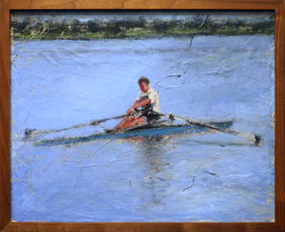 Rower II is a richly layered painting by artist Ed Musante, and is part of a body of work that features a solitary figure, composed to express a mood or feeling. He notes that these works "usually materialize as a result of sanding into layers of paint and paper and letting the resultant marks dictate the direction of the painting."