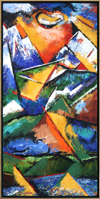 Sunset, Olympic Mountains and Puget Sound is a vibrantly colored painting composed with bold, intersecting geometric forms. This piece is an example of artist John Moilanen's landscape paintings which he notes "recast of perception of the present and past history of the Pacific Northwest through a fusion of abstraction and expressionism which reflects our unique local landscape character."