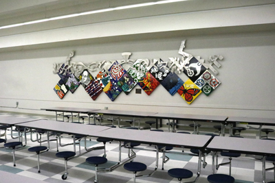 Artist Harold Balazs' wall sculpture Fragments is comprised of painted enamel squares and stainless steel elements. Each square depicts different images that symbolize different subjects and elements of the experience of high school, including references to nature, history, literature, music, sports, mathematics, and science.