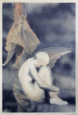 Leaf is a hand colored photograph created by artist Francesca Lacagnina. This piece looks at the formal relationships between the human figure and the structures of plants and animals. She notes, "The human figure permits a remarkable flexibility in conveying personality and character. I use gesture to capture the sense of growth: growth in nature and in the evolution of concept. In combining the natural with the pose I am looking for the link which turns the ordinary into the magical."