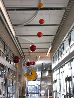 Artist Jacqueline Barnett created the abstract painting Cycles slowly over the course of many weeks. She notes, "I would paint some, let it dry, and then return to the painting weeks later, and cover up many parts, scrape paint from other areas, and keep building the composition. Gradually, the meaning became clear [...] I felt that there was a rhythm in the white life-like shapes, which appeared out of the dark spaces of history. It is a painting meant to honor the cycles of all life and recognize a similarity in all cultures and symbol-making people."