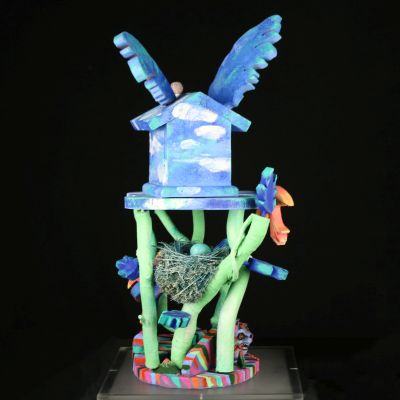 Artist Kay O'Rourke created the colorful and whimsical sculpture Heavenly Bird House from painted willow branches. It is part of a body of sculptures inspired by the many plants and animals on her farm in Spokane, Washington called "Wake Robin's Rest." These sculptures evolved from bird feeders the artist used in her gardens.