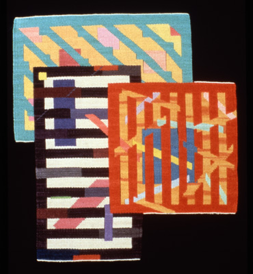 Traps is a weaving by artist Lynn Basa created on a small lap loom designed by the artist's father. Basa describes how the layered geometric design and composition of the piece is meant to reflect on womanhood, and references: "incongruous things trying to fit together, partially obscured, the chaos hanging together by a grid. I think that is a reflection of a woman's life in this society-- putting on different faces to please in all the different roles we play."