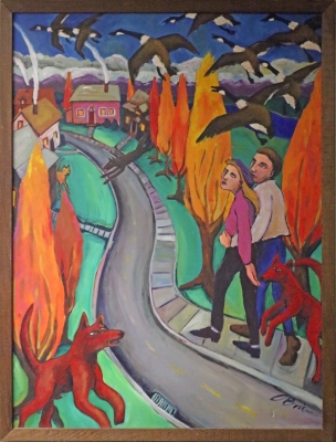 In Honkers Over Lowell, artist Cheri O'Brien captures a whimsical autumn scene from her neighborhood in Everett, Northwestern Washington. The artist used vivid colors and stylized forms to depict a family enjoying the southern migration of a flock of Canada Geese.