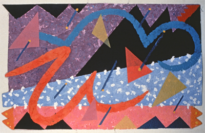 Sunrise Ocean is part of artist Ellen Steinfeld’s body of handmade paper collages. These works focus on landscape imagery of earth and the larger universe. She notes, “The series demonstrates the beauty of hills, flowers, sun showers, vegetation and the planets all coexisting in harmony.”