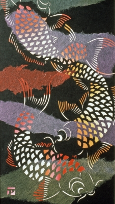 Northwest artist Aki Sogabe created Carps using figurative and abstract forms. The composition suggests swimming fish in a darkened pool.
