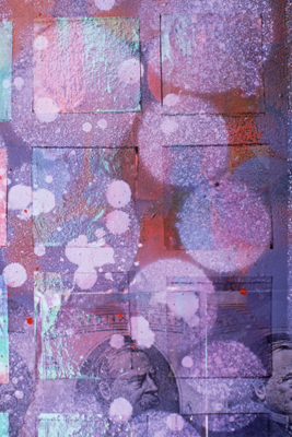 South Sea Bubble is a colorful abstract collage by artist Sidonie Caron. The composition features layers of play money, a grid of Mylar squares, and "bubbles" of spray paint. The idea for the piece is inspired by an economic scam carried out in 18th Century England. The scheme involved creating the "South Sea Company" to promote trade in South America. Many people invested in the company, including the king, George I. Caron notes, "In 1720, the value of the shares of the South Sea Company suddenly and dramatically fell and the whole financial house of cards collapsed. As a result, thousands of Englishmen became impoverished and hundreds became bankrupt. The whole episode is remembered in English history as the bursting of the South Sea Bubble."