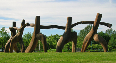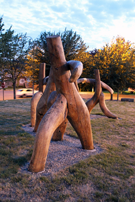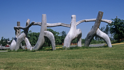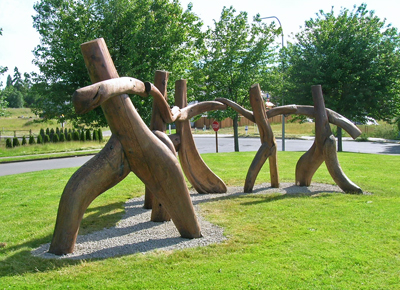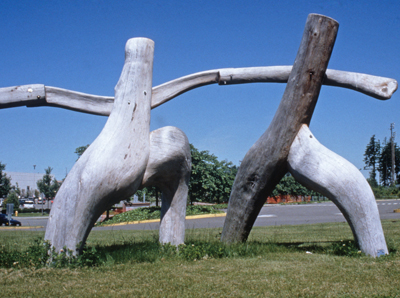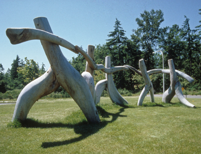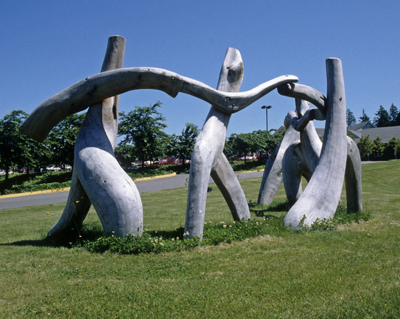 Artist Michael Dennis created the sculpture At Play for the students of Saghalie Junior High. He carved the five abstracted human figures from redcedar. Describing the figures, he notes, "In the joy of their play I hope to capture something of the energetic exhilaration of youth released from the confinement of school."