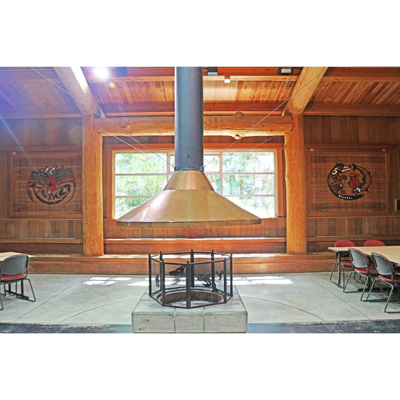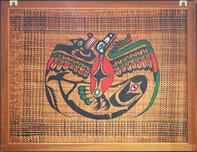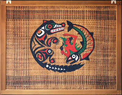 hLukWali #1 and #2 are window panels created by Skokomish master artist Gerald Bruce Miller (subiyay) for the Longhouse at The Evergreen State College. The Longhouse was built in collaboration with many different Northwest Tribes as a gathering place for diverse cultures. The panels are composed of woven cedar bark and painted with symbolic figures.