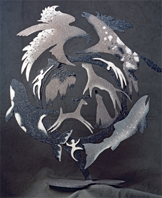 Circle of Friends Series #1 is part of Northwest sculptor David Govedare's body of metal sculptures that highlight the symbolic quality of animal figures. Living on a small ranch in Eastern Washington, Govedare notes "I only depict those creatures that I have shared contact with. We have our own horses and buffalo. I have met a cougar eye to eye at close range and seen the orca break surface in wrangle narrows of Alaska...the development of my art comes from man's ancient urge to document inspiration."